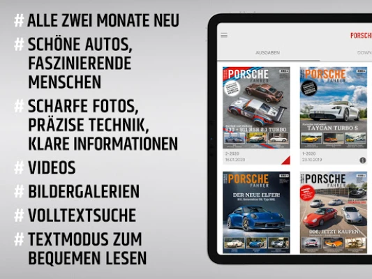 Oplev vores digitale ePaper, der trofast genskaber alle sider fra det trykte magasin, men løfter læseoplevelsen til nye højder med eksklusive digitale forbedringer. Glæd dig over sprudlende billedgallerier og high-definition videoer, der bringer historierne til live. Med direkte links kan du nemt udforske relateret indhold online. Appen tilbyder en kraftfuld fuldtekstsøgning, der lader dig finde præcis det, du leder efter, hvad enten det er inden for en enkelt udgave eller på tværs af hele din samling. Du kan desuden sætte bogmærker ved dine favoritsider og skifte til en behagelig teksttilstand for uforstyrret læsning af længere artikler, hvilket gør det til den ultimative ressource for enhver Porsche-entusiast.