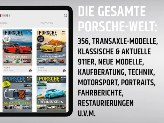 Dyk ned i den fængslende verden af Porsche lige ved hånden med PORSCHE FAHRER. Denne app er din eksklusive adgang til alt, hvad der rører sig inden for det ikoniske bilmærke, fra tidløse klassikere til de nyeste innovationer. Uanset om din passion ligger hos den luft- eller vandkølede 911, den legendariske 356, de unikke Transaxle-modeller, de kraftfulde Turbo-varianter, de elegante Targa- og Cabrio-udgaver, eller de moderne SUV'er som Cayenne og Macan, samt sportsvognene Boxster og Cayman, den eksklusive 918 Spyder eller den luksuriøse Panamera – PORSCHE FAHRER dækker det hele. Her finder du også dybdegående artikler om tuning og meget mere, der tilsammen tegner et komplet billede af Porsche-universet.